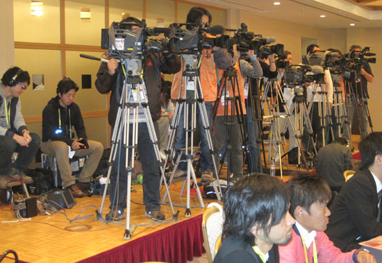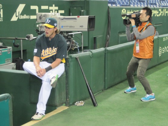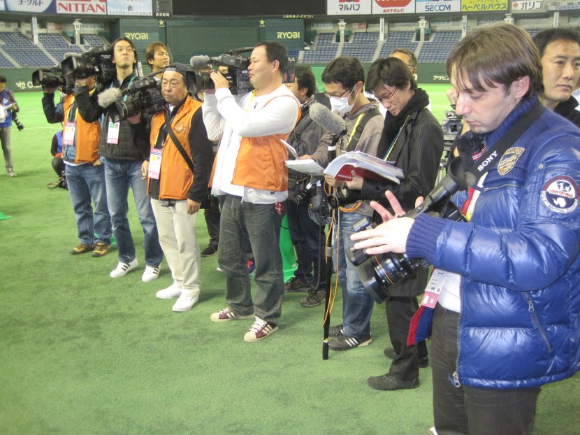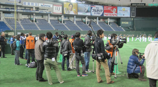 It really cannot be overstated how excited the Japanese media is to cover the Opening Series. The photogs travel in a 20-man amoeba, blobbing from one shot location to the next in constant motion. There’s definitely jostling for prime position, but it’s extremely polite Japanese jostling. While an Ichiro appearance is the obvious headliner, even the most mundane of baseball activities can create a buzz: