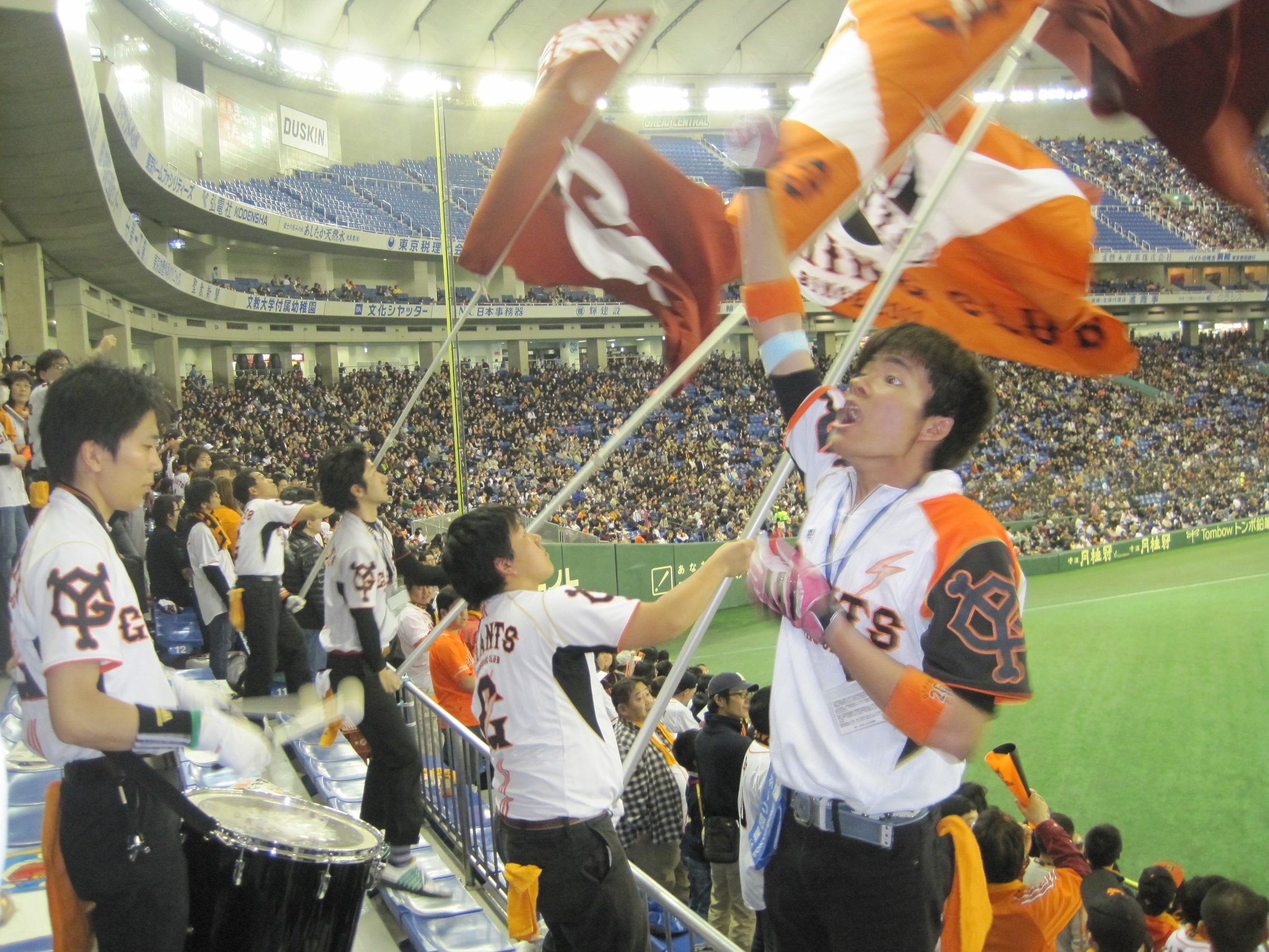 The Yomiuri Giants Cheering Club seemed a little more organized than the Hanshin Tigers edition, complete with customized T-shirts for chant leaders and a team of flag-wavers. Even so, the Tokyo Dome seemed quieter during this game than the earlier A’s-Tigers matchup. The stadium wasn’t completely full — odd, considering the Giants play their home games here — and Giants fans had little to cheer about with their team getting shut out.