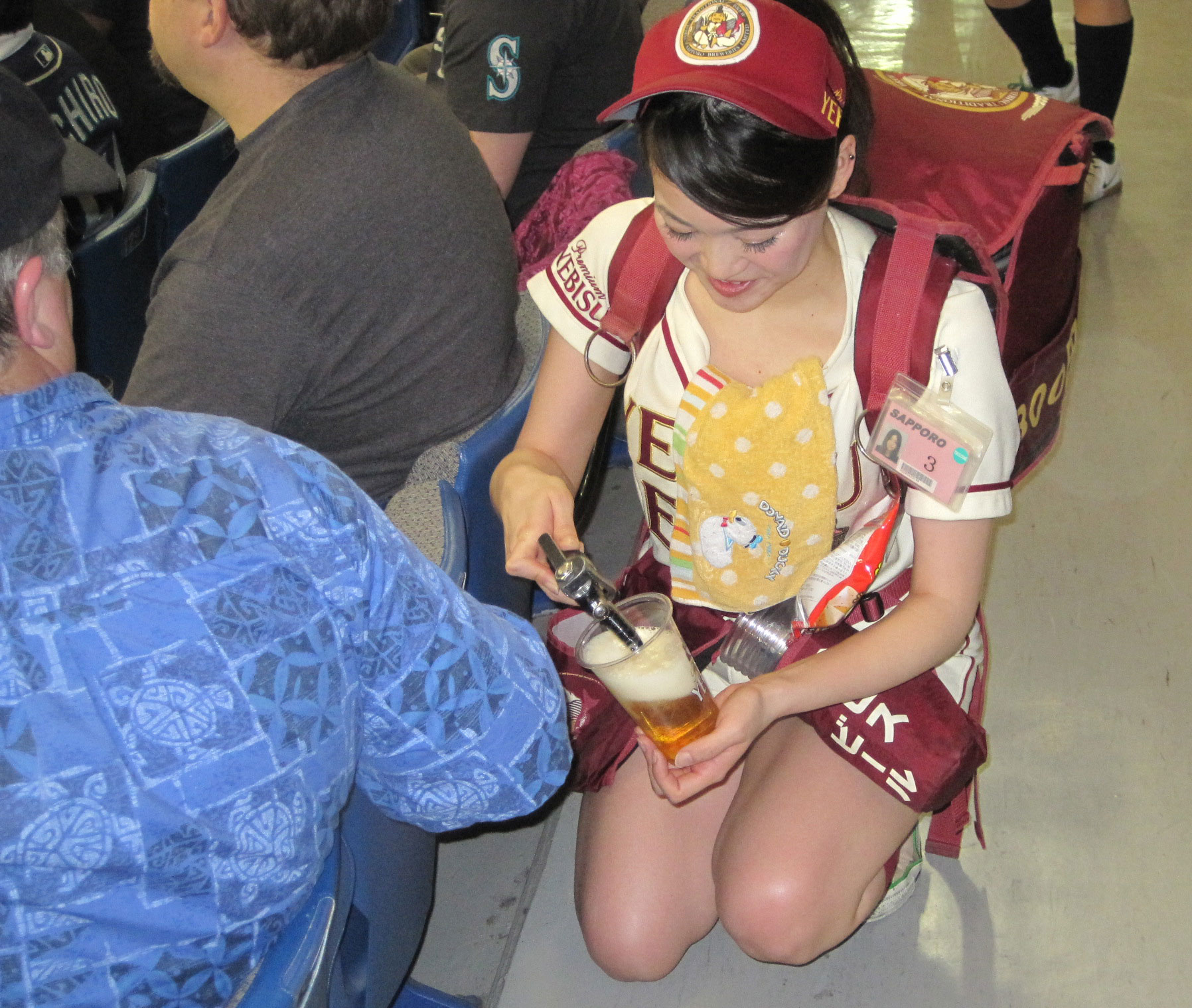 “What if we put a keg in a backpack?” It’s the question every college freshman has asked their bros while trying to get those cute girls on the third floor to come to “a pretty chill pregame” in their dorm room. Well, the Tokyo Dome asked it in reference to beer vendors, and the results are spectacular. Instead of cracking a tall boy for each customer, vendors here strap on a backpack with a mini-keg inside — like the Heineken ones — and pour customers fresh droughts right in the aisle. And rather than middle-aged, beer-gutted beeeeahhhhh heaaaaaaahhhhs hawking suds, every vendor at the Dome is young, female and dressed for summer. There’s no yelling, either. Raise your hand like you’re hailing a cab and a traveling bartender will be at your service within seconds.
