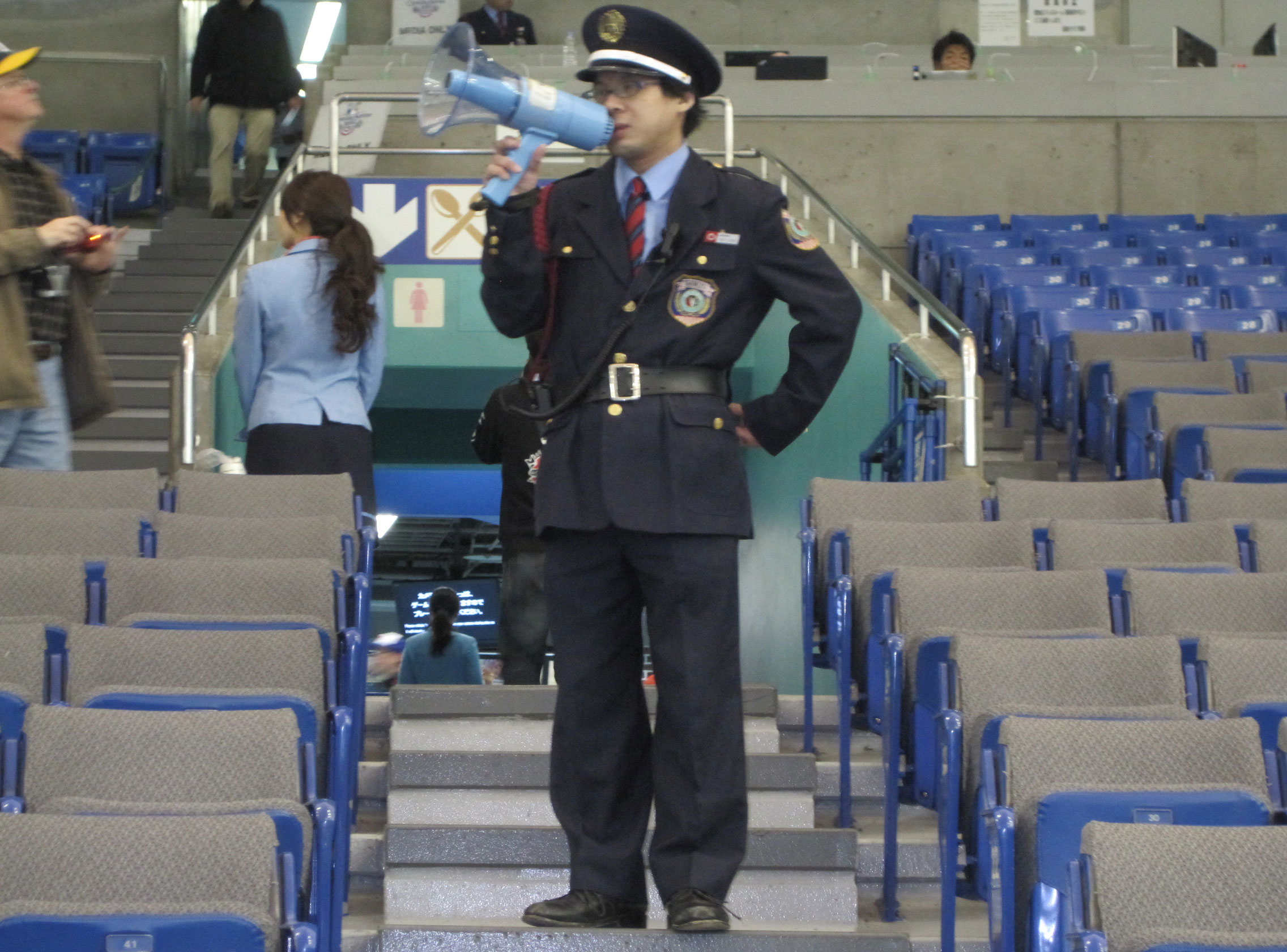 Despite Tokyo’s near-complete lack of street crime and a fanbase that couldn’t be politer, it’s hard to turn around in the Dome without bumping into a security officer. Event staff in dark blue uniforms are posted atop nearly every section and at regular intervals on the concourse. More patrol the aisles and walkways while at least a half-dozen mingle around every major entrance. And this is in addition to the ushers in light blue jackets who check tickets and direct fans to their seats. The funny thing is that the stadium has way fewer restrictions than most MLB parks. I walked from the media section to the first row behind home plate and watched an inning unimpeded. Stood in the aisle and shot five minutes of video, no problem. Entered and left the stands in the middle of many at-bats with just a polite head bow from the blue-shirts.