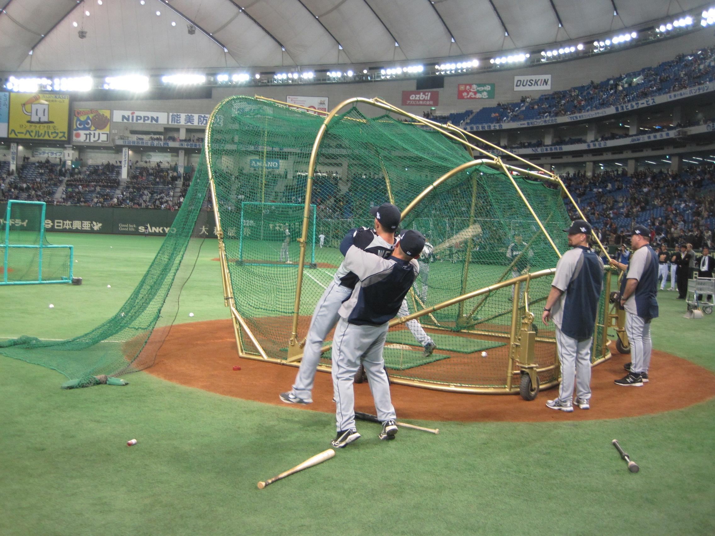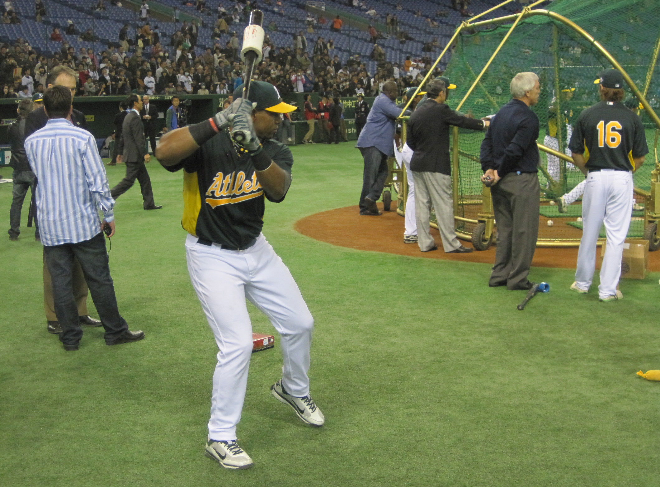 The atmosphere around BP today was a little more “business as usual” than last night. Munenori Kawasaki practiced his breaks down the third-base line as teammates took cuts in the cage. Yoenis Cespedes fine-tuned his swing behind the plate. He later provided roughly 700 BP souvenirs for fans in the left field bleachers. The air only had about 90 percent of last night’s crackle, and the field only had about 75 percent of the suits.