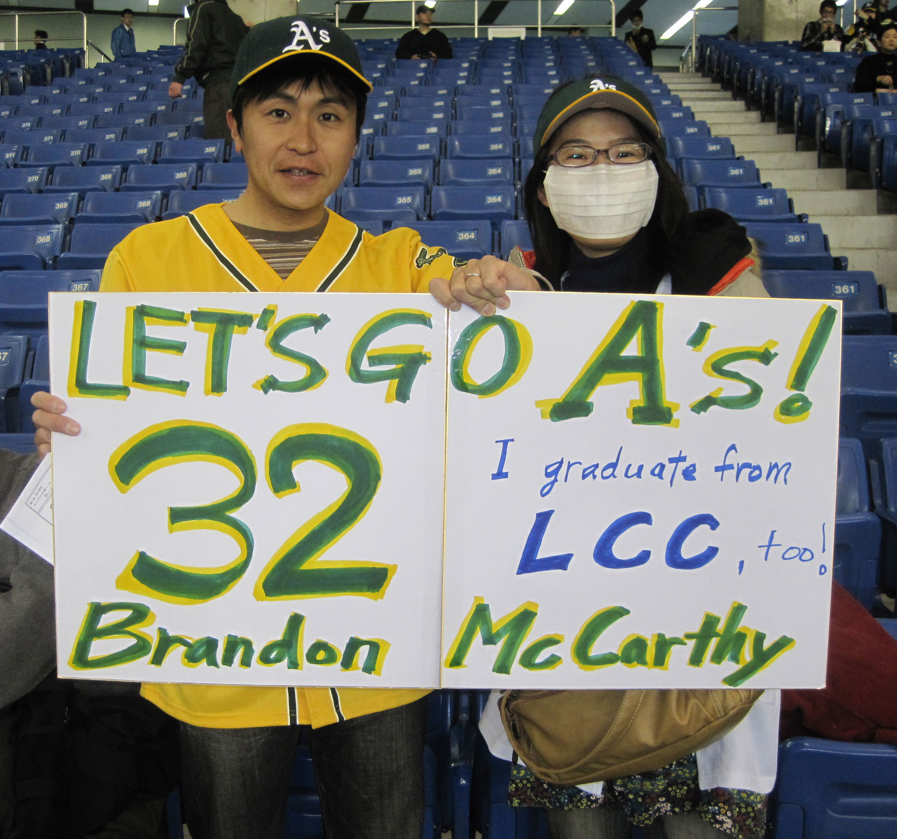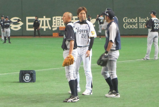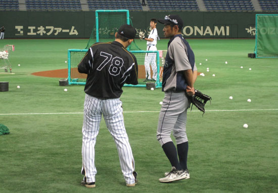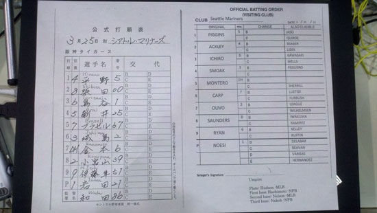 The golden age of domed baseball stadiums has likely come and gone, making it easy to forget the other great advantage of a roof overhead: The same way rain can’t get in, noise can’t get out. With fans in the outfield bleachers chanting continuously, the building feels packed even when it’s three quarters empty — what it lacked in population during Monday’s Oakland-Hanshin game was made up in echoes off empty plastic seats. The thump of a bass drum in the outfield bleachers reverberates throughout the entire dome and walk-up music rains from roof speakers at house concert volume. The dueling band effect when rivals Hanshin and Yomiui play each other is probably Euro soccer-esque.